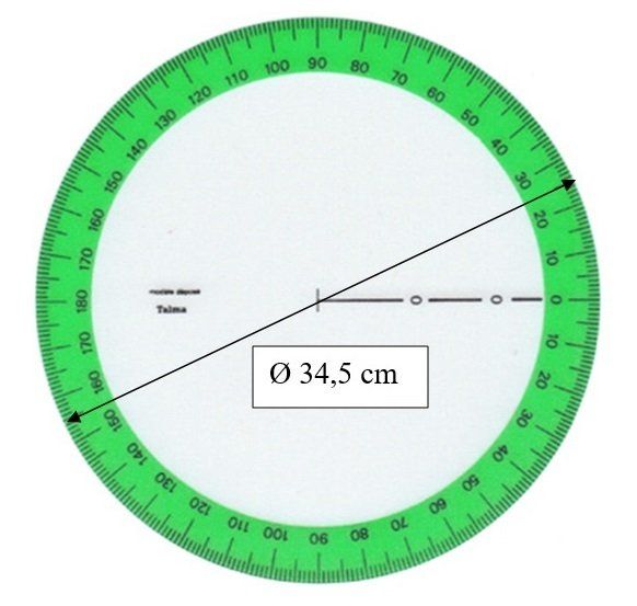 Les rapporteurs ont pour diamètre 10 cm, le Grand rapporteur polaire 34,5 cm.